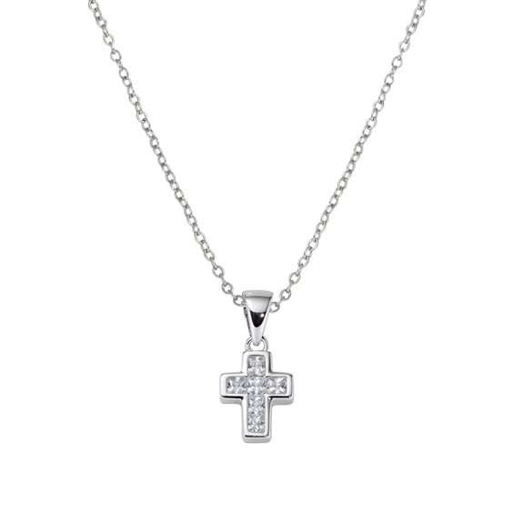 Collana Mini Croce con Zirconi Bianchi Collana a catena in Argento 925 rodiato. Croce pendente di zirconi bianchi taglio carré e profilo liscio. Lunghezza regolabile da 40 a 45 cm con chiusura a moschettone.