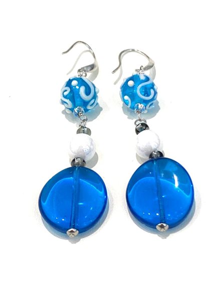 Orecchini con perle di Vetro di Murano di colore blu; lunghezza orecchino 7 cm