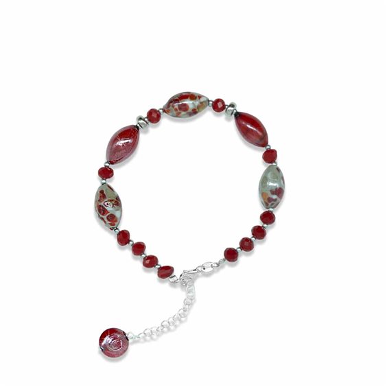 Elegante bracciale artigianale con perle di vetro di Murano di colore rosso; gancio e finali in Argento 925/°°°. Lunghezza personalizzabile da 18 a 21 cm. Gioiello Made in Italy