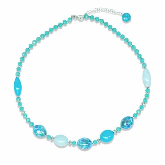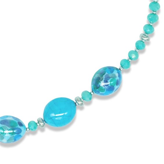 Elegante collana artigianale con perle di vetro di Murano di colore azzurro turchese; gancio e finali in Argento 925/°°°. Lunghezza personalizzabile da 48 a 51 cm. Gioiello Made in Italy