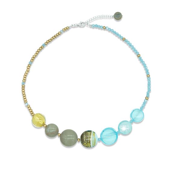 Elegante collana artigianale con perle di vetro di Murano multicolore sulle tonalità turchese e oro; misura personalizzabile da 43 a 45 cm