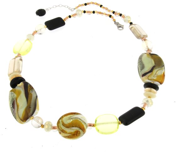 Collana girocollo con perle di Vetro di Murano multicolore su base verde/nero e Argento 925/°°° eseguita artigianalmente da maestri vetrai veneziani