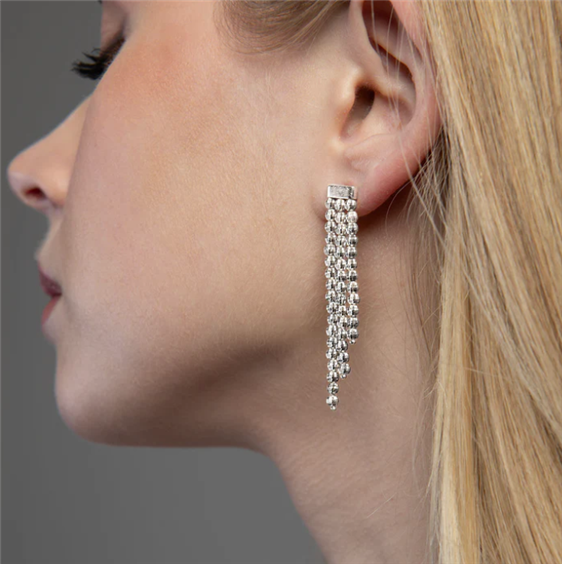 Orecchini composti da 2 file pendenti di sfere diamantate con brevetto Desmos