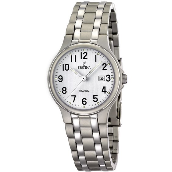 Orologio Solo Tempo 2/3 Sfere Da Donna Di Festina Della Collezione Calendario Titanium. Modello Con Cassa In Titanio Di Forma Rotonda, E Indici Con Numeri Arabi Dipinti. Questo Orologio Ha Bracciale In Titanio. La Resistenza All'Acqua È Di 5 Atmosfere E Il Movimento