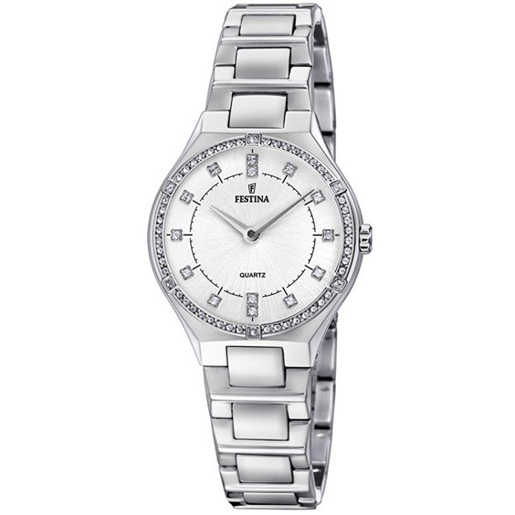 Orologio da Donna Festina, Cassa in acciaio contornata da zirconi, Vetro minerale, Quadrante argento con zirconi come numeri, Cinturino in acciaio, Water Resistant 05ATM.
