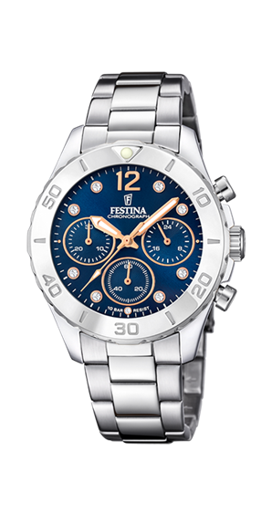 Orologio Festina Boyfriend cronografo al quarzo da donna. Diametro 39mm, spessore 11,5mm, Peso 115gr. Vetro minerale, quadrante blu con cristalli, cassa acciaio 5atm, bracciale acciaio.