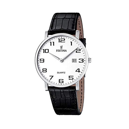 Orologio Festina. Cassa mm 40 in acciaio 316L, cinturino in pelle nero stampato con fibbia. Quadrante bianco con numeri arabi neri stampati, datario al 3, lancette color acciaio. Movimento solo tempo al quarzo. Fondello a pressione, vetro minerale. Impermeabilità 3 atmosfere.