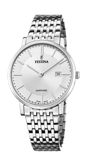 Orologio Festina Swiss Made Collection solo tempo al quarzo da uomo, diametro 39,5mm, spessore 7mm, peso 85gr. Vetro zaffiro, quadrante argento con indici, cassa acciaio 5atm, bracciale acciaio.