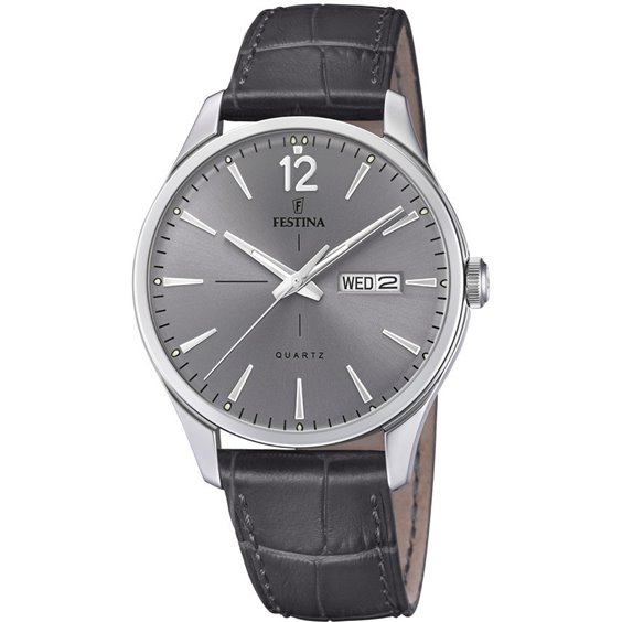 Elegante orologio solo tempo al quarzo con giorno e data; cassa in acciaio inossidabile con cinturino in pelle stampa coccodrillo di colore grigio. Originale quadrante di colore antracite chiaro; water ressistant 5 ATM, fondello a pressione , vetro minerale.