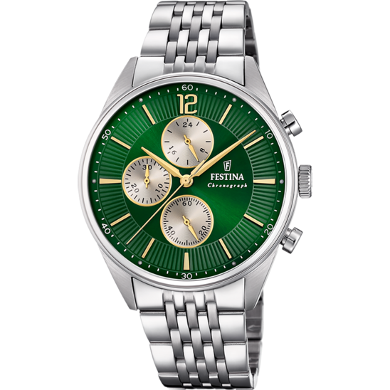 Elegante cronografo da uomo al quarzo con cassa e cinturino in acciaio; vetro minerale e quadrante di colore verde con contatori silver e indici dorati