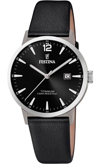 Orologio solo tempo al quarzo con cassa in titanio e cinturino di pelle nera; quadrante di colore nero con indici e sfere di colore argento. Vetro minerale e water resistant 5 ATM