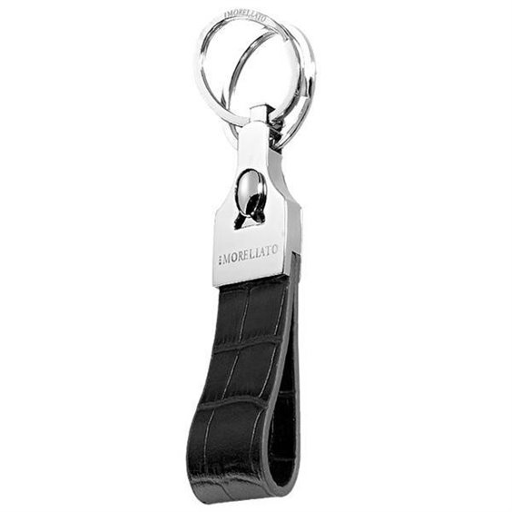 Portachiave per uomo , doppio moschettone in acciaio 316L , pelle nera stampata opaco , lunghezza cm 14. Immagine indicativa , la confezione può variare di forma e colore.