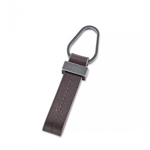 Portachiavi maschile in pelle di colore marrone scuro con fibia annerita dal sapore vintage. Anello in metallo brunito, lunghezza complessiva 11cm