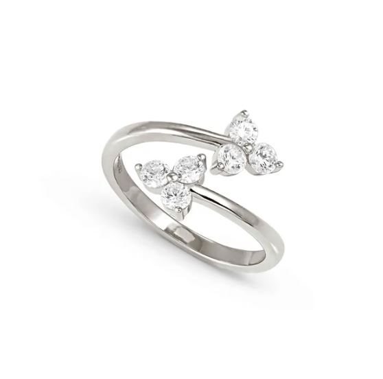 Anello in Argento con rivestimento superficiale realizzato mediante bagno galvanico in Rodio Bianco. La sua forma abbraccia il dito e lo slancia in maniera elegante e raffinata, valorizzando la mano con luminosità. Un regalo perfetto per una dichiarazione d'amore. Materiale Argento rodiato bianco Pietre preziose Cubic Zirconia Misura S = 11-14