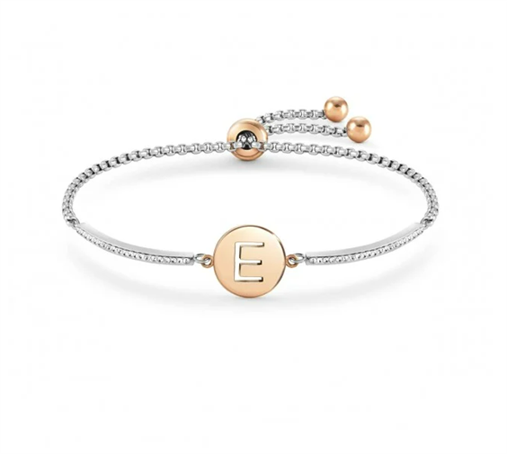 Bracciale con pendente con Lettera E in Acciaio 316/304 anallergico, dettagli in PVD rosa e pavé di Cristalli bianchi. Lunghezza 19 cm, adattabile a 14 cm. Misura del pendente 1,2 x1,2 cm.