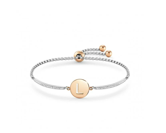 Bracciale con pendente con Lettera L in Acciaio 316/304 anallergico, dettagli in PVD rosa e pavé di Cristalli bianchi. Lunghezza 19 cm, adattabile a 14 cm. Misura del pendente 1,2 x1,2 cm.
