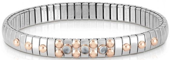Bracciale estensibile in acciaio con borchie in oro rosa 375/°°° e Topazio azzurro naturale. Lunghezza personalizzabile su richiesta