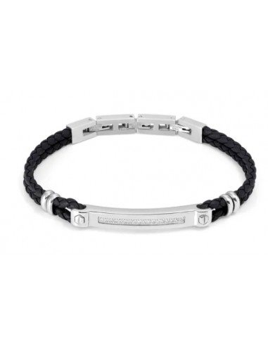 Bracciale un pelle nera con targhetta in acciaio con zirconi