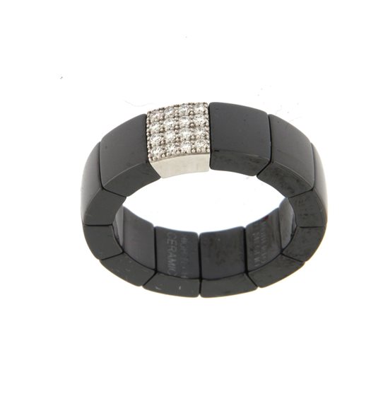 Anello estensibile in ceramica high tech nera lucida, collezione SCACCO, con un elemento in oro bianco 750/°°° e Brillanti. L'anello è reso morbido da una duplice molla interna che permette di indossarlo comodamente ogni giorno. Tutti i gioielli Roberto Demeglio hanno una garanzia a vita contro l'usura delle molle e degli elementi in ceramica