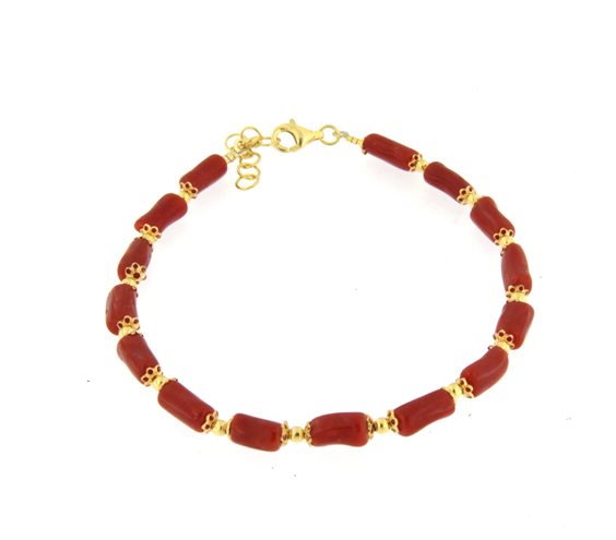 Bracciale in Argento dorato 925/°°° con tubicini di corallo rosso naturale; misura personalizzabile da 20 a 22 cm