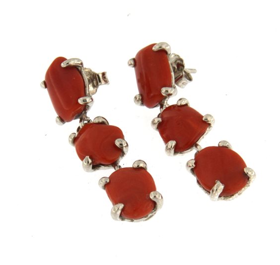 Eleganti orecchini pendenti in Argento 925/°°° con corallo naturale; lunghezza complessiva orecchino 4 cm