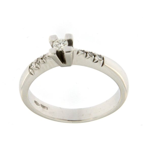 Anello solitario in oro bianco 750/°°° con diamante naturale, taglio brillante, purezza VS1 colore G. Elegante montatura con brillanti incastonati sul gambo ct. 0,04; misura numero 16 personalizzabile su richiesta.