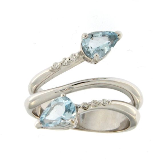 Anello in Oro bianco 750/°°° con 2 Acquamarine naturali a goccia di ct. 1,30 e brillanti naturali per una caratura complessiva di ct. 0,06.