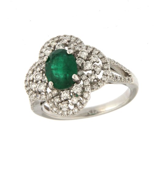 Anello in Oro Bianco 750/°°° (18 Kt) con Smeraldo e Brillanti naturali; misura dito numero 14 personalizzabile su richiesta presso il nostro laboratorio
