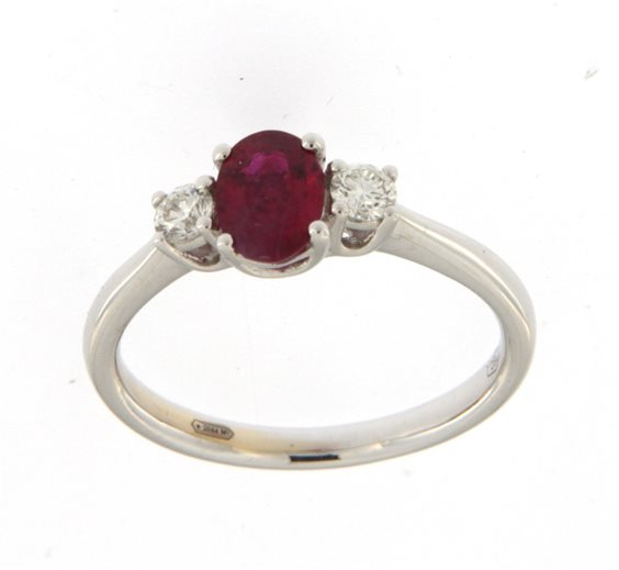 Anello in Oro Bianco 750/°°° (18 Kt) con Rubino Naturale (Ct. 0,76) con 2 brillanti laterali (VS2-G) di Ct. 0,21; misura dito facilmente personalizabile