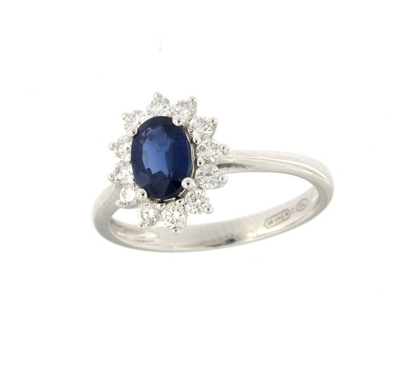 Anello da donna in Oro Bianco 750/°°° (18 Kt) con Zaffiro Naturale Ct.0,596 e Brillanti Naturali Ct.0,43 (VS2-G). Misura dito 15 personalizzabile su richiesta