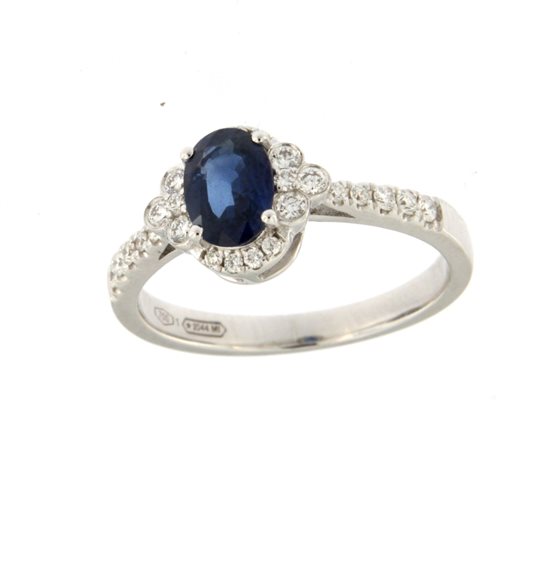 Anello in Oro Bianco 750/°°° (18 Kt) con Zaffiro Naturale Ct.0,94 e Brillanti Naturali Ct.0,27 VS2-G. Misura dito 14 personalizzabile presso il nostro laboratorio orafo su richiesta