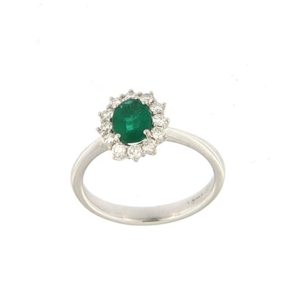 Anello in Oro Bianco 750/°°° (18 Kt) con Smeraldo ovale di Ct. 0,72 con contorno di Brillanti per una caratura complessiva di Ct.0,35 (VS2-G). Misura dito numero 14 personalizzabile su richiesta presso il nostro laboratorio