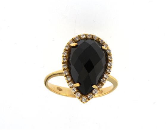 Anello da donna in Oro Giallo 750/°°° (18 Kt) con Onice sfaccettato taglio goccia contornato da zirconi. Misura dito personalizzabile presso il nostro laboratorio su richiesta.