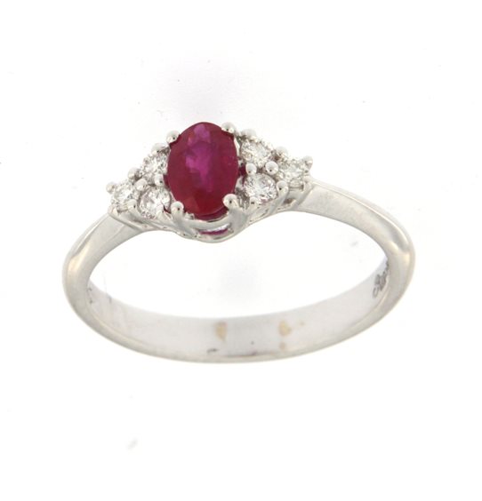 Elegante anello in Oro Bianco 750/°°° (18 Kt.) con Rubino naturale di Ct.0,50 (misura 6x4mm) e Brillanti naturali di Ct. 0,18 (VS2-G); misura dito personalizzabile su richiesta presso il nostro laboratorio