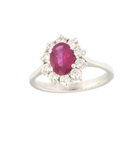 Classico anello da donna in Oro Bianco 750/°°° con Rubino naturale centrale provenienza Mozambico (6x8 mm) di Ct. 1,30 e contorno di Brillanti Naturali di Ct. 0,70 (VS-F); misura dito numero 15 personalizabile su richiesta presso il nostro laboratorio