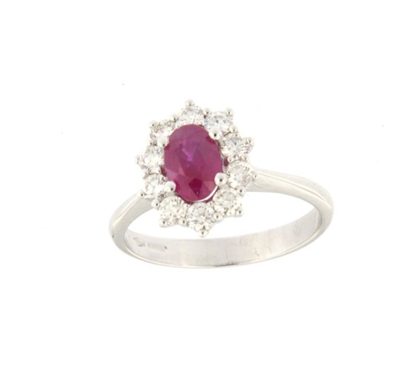 Classico anello da donna in Oro Bianco 750/°°° con Rubino naturale centrale provenienza Mozambico (7x5 mm) di Ct. 1,04 e contorno di Brillanti Naturali di Ct. 0,57 (VS2-G); misura dito numero 13 personalizabile su richiesta presso il nostro laboratorio