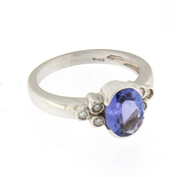 Anello di nostra produzione in Oro Bianco 750/°°° (18 Kt) con Tanzanite Naturale di Ct.1,78 arricchita con tre brillanti per lato purezza VS e colore G aventi una caratura complessiva di Ct.0,06. Misura anello 14