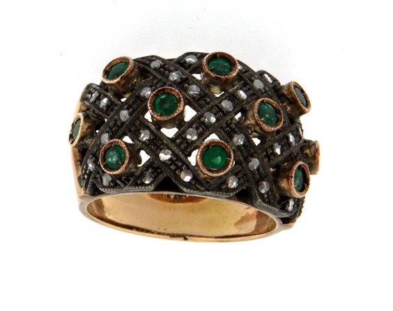 Anello da donna in Oro Giallo 585/°°°(14Kt) e Argento con rosette di diamante e Smeraldi naturali