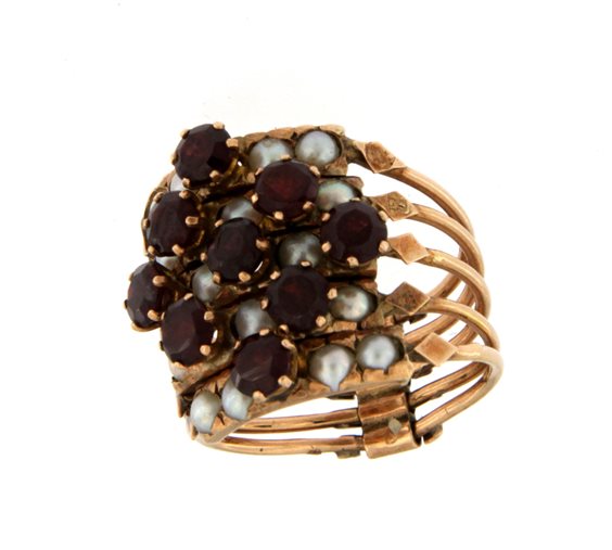 Anello da donna stile antico in oro rosa 585/°°°(14Kt) con granati naturali e perline