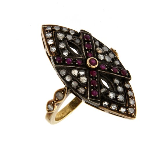 Anello da donna stile antico in oro giallo 750/°°°(18Kt) e argento con diamanti e rubini.