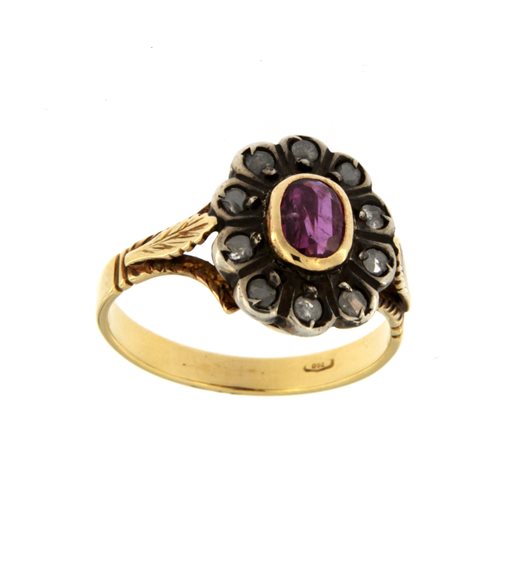 Anello da donna stile antico in oro giallo 750/°°°(18Kt) e argento con rubino naturale e rosa di diamante.