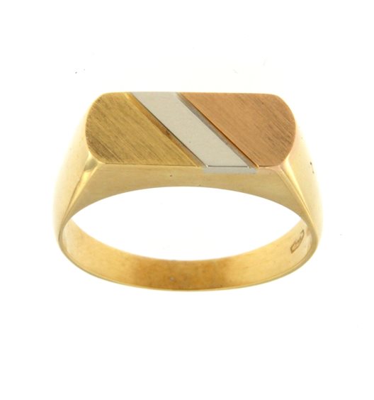 Anello da uomo in oro 750/°°°(18Kt) con gambo in oro giallo e scudo in oro tre colori.