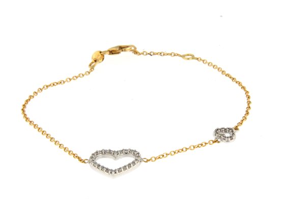 Bracciale a catena da donna, Oro bicolore 750/°°°(18Kt) con cuori tempestati di zirconi. Lunghezza 17cm.