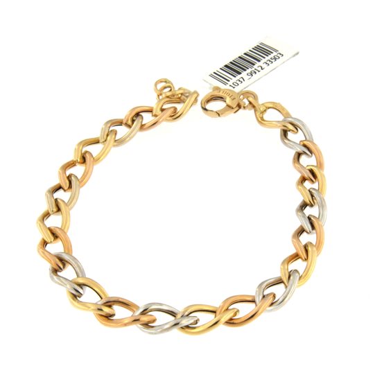 Bracciale da donna a catena in oro giallo 750/°°° (18 Kt) con alcuni anelli in oro bianco e oro rosa; misura personalizzabile da 19 a 20 cm.