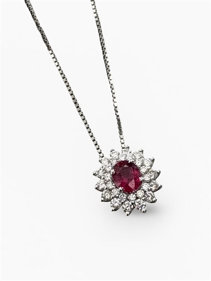 Collana in Oro Bianco 750/°°° con ciondolo in Oro Bianco 750/°°° con Rubino di Ct.0,41 e Brillanti di Ct.0,53