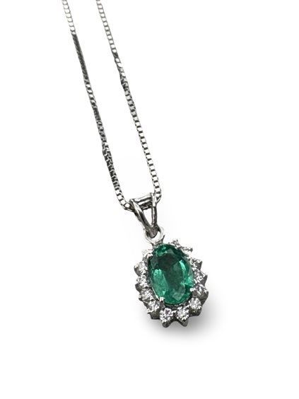 Collana in Oro Bianco 750/°°° con ciondolo in Oro Bianco 750/°°° con Smeraldo Naturale di Ct.0,79 e contorno di Brillanti Naturali di Ct.0,23