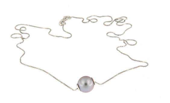 Collana in Oro Bianco 750/°°° (18 Kt) con perla coltivata in acqua dolce di colore grigio e diametro 7mm; lunghezza della collana 42 cm