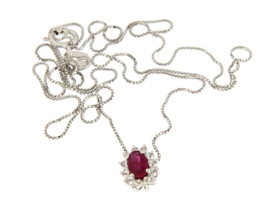 Collana in Oro Bianco 750/°°° (18 Kt) con ciondolo montato a margherita con Rubino Naturale di Ct.0,30 e Brillanti Naturali Ct.0,07 SI-G; lunghezza della collana 42 cm