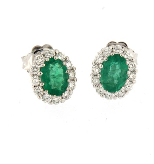 Classici orecchini a lobo in Oro Bianco 750/°°° (18 Kt.) con Smeraldi naturali di Ct.1,48 (misura 7X5mm) e Brillanti naturali di Ct. 0,62 (VS2-G)