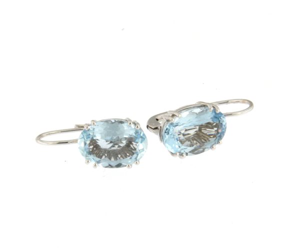 Classici orecchini in Oro Bianco 750/°°° (18 Kt) con Acquamarina Naturale di complessivi Ct.10,02; pratica chiusura a monachella